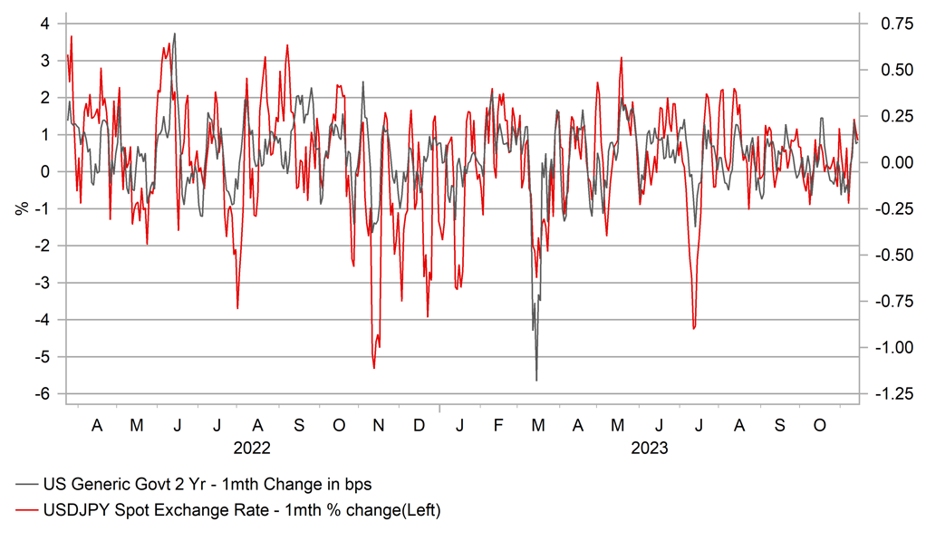 After advancing last week to the point of nearly recouping all the losses from the previous week, the US dollar has started this week on the backfoot with some moderate selling ahead of the key US data today – the CPI data for October. The one currency that was weak throughout most of yesterday was the yen but this changed with a sudden advance which prompted speculation of intervention. Finance Minister Suzuki did speak yesterday and expressed the usual concerns over yen weakness but the comments were nothing out of the ordinary and the lack of follow-through on the reversal in USD/JPY once a new intra-day high of 151.91 was recorded underlined the probability that this was not intervention by the Japanese authorities – option-related selling more likely. Yield will continue dominate USD/JPY direction for now and the week-on-week change in USD/JPY remains tightly linked to the week-on-week change in the UST bond 2-year yield as can be seen in the chart below.