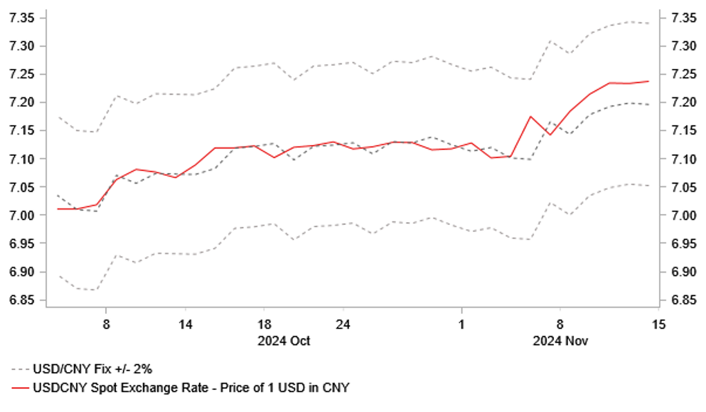 Asian currencies have continued to weaken overnight with the Malaysian ringgit and Indonesian rupiah hit the hardest as they continue to reverse strong gains recorded over the summer. In contrast, weakness in the renminbi has been dampened by the PBoC’s decision to set a stronger daily fixing rate which was lowered by marginally by 25pips to 7.1966 sending a signal to market participants that they will try to slow the adjustment higher in USD/CNY. The spot rate is currently trading just below the 7.2500-level and there is room for the pair to keep moving closer to the top of the +/-2% daily trading band that currently comes in at 7.3405. We expect the renminbi to weaker further in the year ahead as the incoming Trump administration moves to impose higher tariffs on imports from China. Our latest forecasts for USD/CNY show the pair moving up towards the 7.5000-level in the year ahead. In other developments overnight, Chinese policymakers have announced further policy steps to support the housing market including cutting taxes for homebuyers and developers. Home purchase deed taxes for first and second house buyers of flats of 140 square meters and below have been cut to 1% from as much as 3%. The threshold for land appreciation tax has been lowered by 0.5 percentage point.