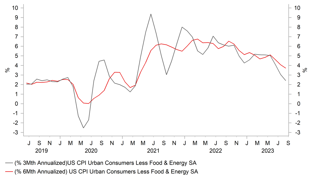 The relative stability for the major foreign exchange rates has continued ahead of today’s ECB policy meeting. The release yesterday of the latest US CPI report for August has had only a limited impact on FX performance. The dollar index initially strengthened just after the release of the US CPI report hitting an intra-day high of 104.97 but has since fallen back towards 104.60. The dollar index attempted earlier this year to break above the 105.00 on a sustained basis back in late February and early March and failed before correcting back into the 100.00 to 105.00 range where it has been trading for most of this year. The US dollar initially rallied after the US CPI report was released as it revealed that core inflation picked up by 0.3%M/M from increases of 0.2%M/M in the previous two months. The pick-up was even more marked for the super core measure of core services inflation less housing which jumped by 0.37%M/M up from 0.19%M/M in the previous month. However, there is still clear evidence of a slowdown in core inflation over the last three months even after taking into account the stronger reading for August. Over the last three months core inflation has increased by an annualized rate of 2.4% which compares to a rate of 5.0% in May. Even over a longer period of the last six months there has been a clear slowdown in core inflation to 3.7% in August from 5.1% in February. It helps to partly explain why the initial hawkish repricing in the US rate market and stronger US dollar reaction have failed to be sustained. Core inflation would have to pick-up further in the coming months to increase pressure on the Fed to raise rates further. US rate market pricing is even less hawkish now than prior to the CPI report release. A rate pause for the Fed is priced as a done deal for this month, around 11bps of further hikes by the end of this year, and 93bps of cuts priced in for next year. The stronger core CPI reading for August was mainly driven by the overshoot relative to expectations for vehicle insurance up 2.4%M/M and airline fares up 4.9%M/M. Market participants are assuming that the Fed will put more weight on the slowing trend for core inflation when setting policy and continue to look through upside risks to headline inflation for rising energy prices. In August headline inflation increased sharply by 0.6%M/M driven by a 10.6% jump in gasoline prices.