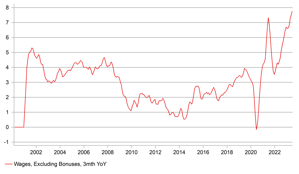 Another month and another stronger than expected wage growth reading in the UK jobs data. The 3mth YoY annual wage growth rate accelerated from an upwardly revised 7.2% (6.9%) to 8.2% (expected 7.4%) while the ex-bonus reading accelerated from 7.5% (7.3%) to 7.8% (expected 7.4%) and will make for uncomfortable reading for the BoE. However, there will be another jobs report before the Sept meeting. As we have seen before, the strong wage growth readings were accompanied by signs of weakening labour demand. The 3mth/3mth employment change revealed a 66k drop in jobs while the unemployment rate jumped from 4.0% to 4.2%. We have now had a 0.7ppt increase in the unemployment rate from the low of 3.5% which is meaningful.