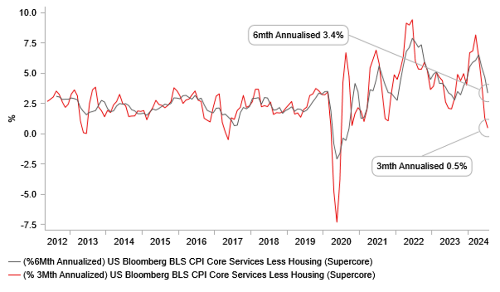The data wasn’t universally favourable and the key component within the CPI data that is expected to slow further going forward – rents – actually picked up. Shelter increased 0.4% MoM, double the rate in June while OER increased 0.1ppt to 0.4% as well. Nonetheless, given the overall CPI was in line with expectations means that elements of CPI outside of rents were softer than expected. The supercore 3mth and 6mth annualised rates are now falling sharply and underline the continued softening trend in underlying “sticky” inflation that has concerned the Fed for much of the past year. This data is clearly the type of good news that was required in order to justify a rate cut in September.