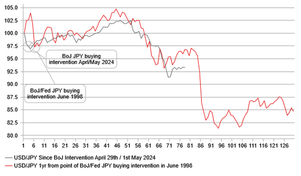 There are some similarities with 1998 in recent macro developments and the move in USD/JPY. The Fed and BoJ intervened to sell USD/JPY in June 1998 as the pair approached 150. The move lower faded, USD/JPY retraced higher but then Russia defaulted, contagion spread, a hedge fund (LTCM) collapsed, the Fed then cut inter-meeting and cut three times in total between September and November 1998. The increased risk aversion prompted a massive liquidation of yen shorts and USD/JPY plunged from 135 to close to 110 in three trading days! While we are not obviously suggesting a repeat of that, the point here is that after yen buying intervention again in April/May and then the big initial drop and the fall in US yields, USD/JPY is clearly more vulnerable to renewed volatility that would spark a further round of yen buying.