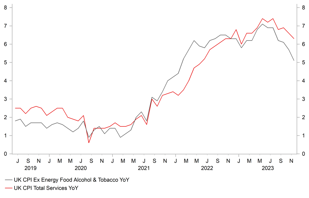The BoE is still expected to lag behind both the Fed and ECB when cutting rates in the year ahead. The first 25bps cut from the BoE is not fully priced until 20th June MPC meeting. In comparison the first 25bps rate cuts from the Fed and ECB and fully priced in by their 1st May and 11th April policy meetings respectively. For this year as a whole, the UK rate market is roughly pricing in around 25bps less of cuts than in the euro-zone and US. The divergence continues to reflect investor concerns that there is a higher risk of inflation proving more persistent in the UK. Those concerns were eased somewhat by reassuring evidence of slowing inflation and wage growth at the end of last year which contributed to GBP underperformance in December. In the week ahead, the release of the latest UK CPI (Wed) and labour market (Tues) reports will be scrutinized even more closely to better assess whether the disinflationary developments evident in December will be sustained. Inflation is running well below the BoE’s own forecast from the November QIR in which they forecast headline and core inflation ending last year at around 4.6% and 5.6% respectively. We expect significant downward revisions to the BoE’s inflation forecasts in February.