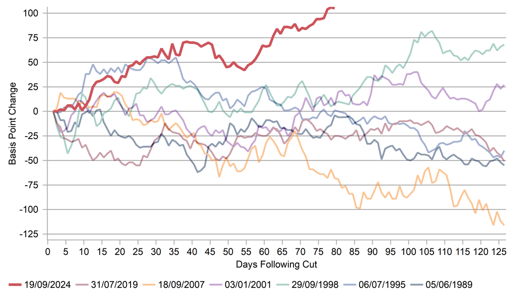 INFLATION CONCERNS SINCE THE FOMC CUT RATES IN SEPT HAS SEEN 10-YEAR YIELDS MOVE FAR HIGHER THAN IN PREVIOUS FED EASING CYCLES