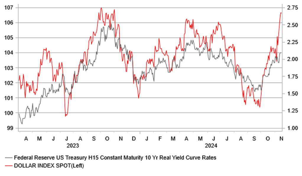 The 2-year UST bond yield jumped 8bps and was up 12bps yesterday from the intra-day low in response to the speech last night from Fed Chair Powell that pointed to a possible early indication of an intention of the FOMC to pause its easing cycle. The scale of the move in front-end rates was notable in that it had limited impact on lifting the US dollar and indeed the DXY index is now already below the level that was trading just prior to when Powell began to speak. This is perhaps not a surprise and it does point to the potential for the dollar to enter a consolidation phase given the sharp move stronger since Trump’s election victory. We suspect the positive momentum we have seen since and before the election may now start to fade.