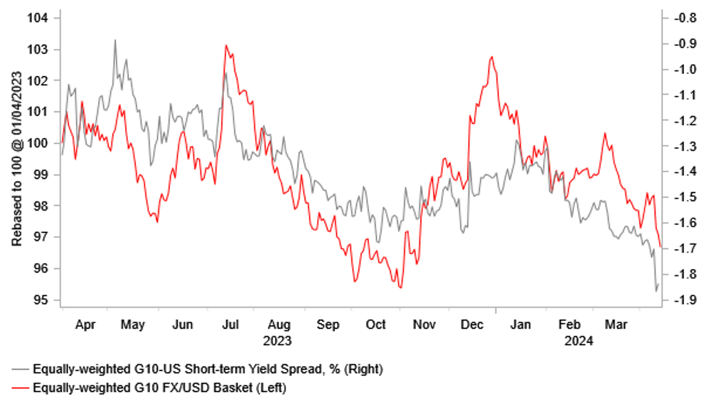 Market participants will be listening closely to comments from Fed officials this week including Fed Chair Powell later today to see how their plans for monetary policy are adjusting in response to the recent run of stronger US activity and inflation data. New York Fed President Williams indicated yesterday that he didn’t see the recent inflation data as a “turning point” but added the figures will affect his opinion and forecasts. He still believes that the Fed will begin lowering rates this year if inflation contuse to gradually come down. He also added that Fed officials are watching the unfolding situation in the Middle East “very carefully” though he didn’t see it as a major driver of the Us outlook at the current juncture. The initial market reaction to escalating tensions between Israel and Iran has been muted. The price of Brent has remined relatively stable at just over USD90/barrel. Market participants are still waiting to see how Israel will respond to the attack over the weekend from Iran. Bloomberg has reported that top Israeli military officials have reasserted that their country has no choice but to respond to Iran’s weekend drone and missile attack, even as European and US officials have called on Israel to avoid a tit-for-tat escalation that could provoke a wider war in the region. Heightened geopolitical tensions and the risk of another global energy price shock are further boosting the relative appeal of the US dollar in the near-term.