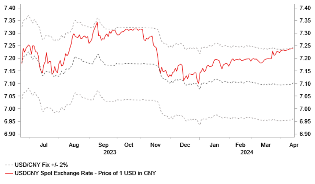 The other main development overnight from China was the release of the latest economic activity data for March. It was confirmed that economic growth in China strengthened in Q1 as a whole when it expanded by 5.3%Y/Y and 1.6%Q/Q. Growth in Q4 of last year was also revised higher by 0.2ppt to 1.2%Q/Q. Fixed asset investment expanded strongly by 4.5%Y/Y in Q1 following growth of 3.0% in 2023 highlighting the supportive impact from government stimulus. Stronger growth at the start of this year has though helped to ease some pressure on policymakers in China to provide further stimulus to support growth. However, the monthly activity data for March has cast some doubt on whether the pick-up in growth will be sustained. Industrial production and retail sales growth both were much weaker than expected in March when activity slowed to 4.5%Y/Y and 3.1%Y/Y respectively. Overall, the pick-up in growth at the start of this year in China supports our relatively more upbeat growth forecast (click here). However, it has not been sufficient to prevent the renminbi from weakening further against the US dollar. If US yields and US dollar continue to rise in the near-term, it is more likely that USD/CNY will be allowed to gradually drift back up to last year’s highs at closer to the 7.3000-level.