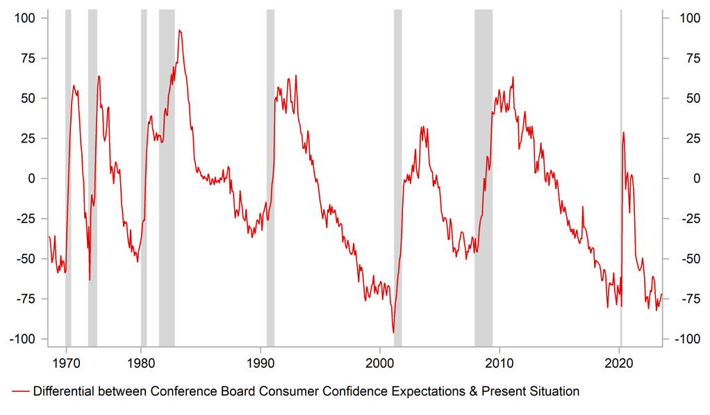 That said, it is important to remember the turn of an economy from resilience to recession can be quite abrupt and quick. Looking back at the Control Group 3mth annualised rate you can see for example that there was growth of 6% in November 2007, the month before the NBER-determined recession began in the US. The chart above highlights the current differential between the Conference Board indices for Current Conditions and Expectations with consumer expectations relative to current conditions at levels always consistent with recession. So current conditions for US consumer are pretty good but expectations relative to this remain extremely low underlining the angst that could result in quite a sudden change. So while the data remains resilient we could see that change quite suddenly.