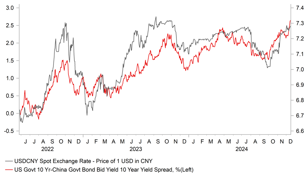 Unlike Chinese yields, US yields have rebounded so far this month helping to widen the yield spread between the US and China. After hitting a low of 4.13% on 6th December, the 10-year US Treasury yield has since climbed back up towards recent highs at closer to 4.40%. The pick-up in US yields has happened even as the US rate market has moved to more fully price in another 25bps rate cut from the Fed this week after the release of softer CPI and PPI reports for November. What will be more important for US dollar direction after this week’s FOMC meeting will be the Fed’s update guidance for future rate cuts. Recent comments from Fed officials including Chair Powell have expressed more caution over plans to keep cutting rates setting up market participants over the possibility that the Fed will slowdown and skip a meeting early next year rather than continuing to cut at back-to-back meetings. Please see our latest FX Weekly report for more details (click here).