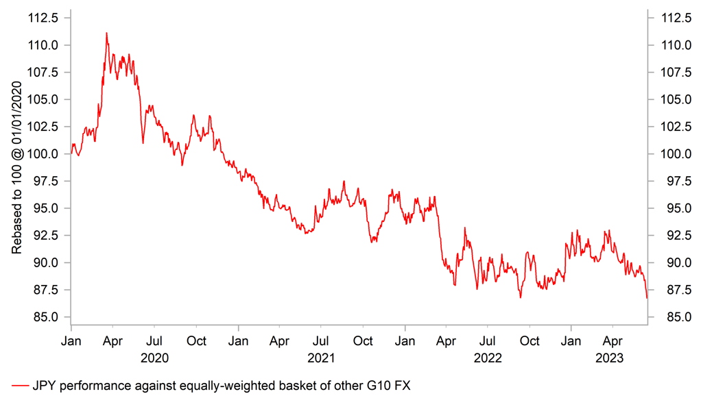 It stands in contrast to the recent run of hawkish policy surprises this month from the RBA, BoC, Fed (click here) and ECB that has lifted yields outside of Japan back up towards year to date highs. The widening yield spreads between Japan and overseas alongside lower FX and rates volatility is making yen funded carry trades more attractive, and contributing to the yen becoming more deeply undervalued.