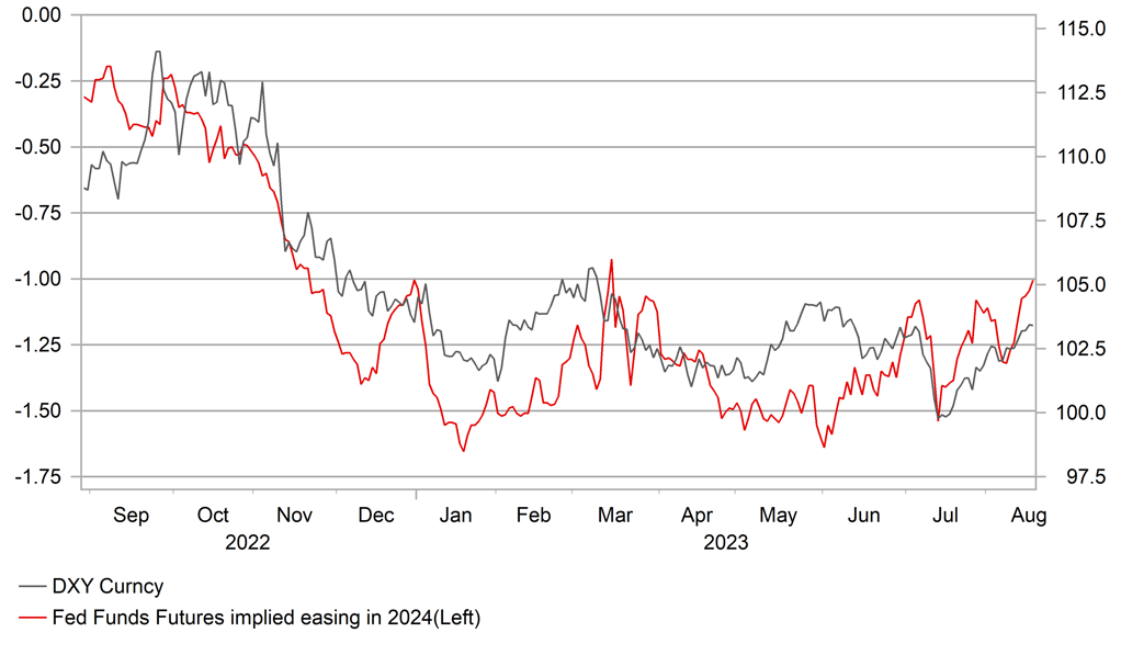 The move in US yields comes in the aftermath of more stronger than expected data. Housing Starts and Industrial Production data for July helped reinforce the prospect of strong GDP growth in Q3. The Atlanta FedNow GDP tracker for Q3 is now running at 5.8% underlining the potential for the markets to reconsider its call for an end to Fed tightening and/or the extent of rate cuts priced in 2024. Last week, the Dec-23-Dec-24 fed funds futures spread implied 125bps of easing. Now that has shrunk to 100bps.