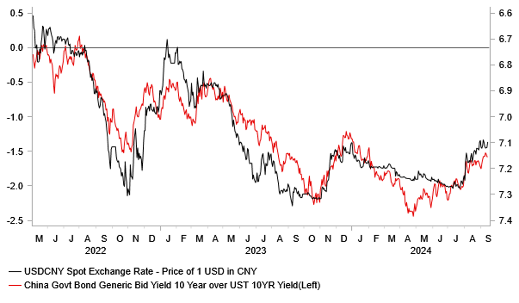 USD/CNY VS. US-CHINA LONG-TERM YIELD SPREAD
