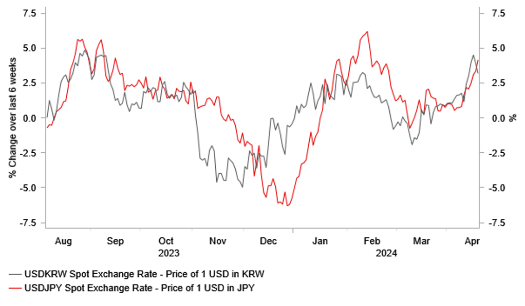 However, market participants would still be sceptical whether it would prove effective at turning around weakness in both the yen and won while US yields continue to march higher in response to the recent run of stronger US activity and inflation data. The US rate market is not even fully confident now that the Fed will deliver just two rate cuts by the end of this year. It is likely for this reason that officials from Japan in particular have been reluctant to intervene over the past week even as USD/JPY has continued to move sharply higher up towards the 155.00-level. The joint statements do though show their patience for tolerating currency weakness is wearing thin thereby further increasing the imminent risk of intervention. After the joint statement was released Japan’s top currency official Masato Kanda stated that “it is serious concerns rather ordinary concerns”. He said that the agreement on language about currency weakness itself was an achievement, as that hasn’t been done in recent years.
