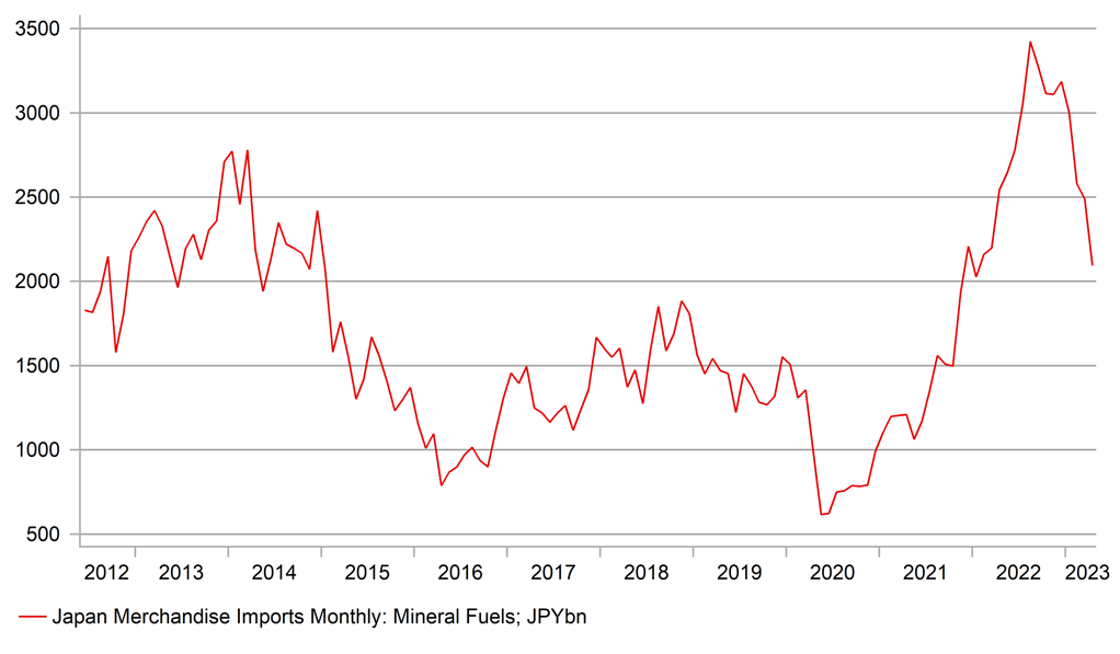 One of those changes we have highlighted is the turn in the energy markets that has seen the huge negative energy terms of trade shock start to reverse. The MoF released April trade data today and we saw Japan’s trade deficit continue to shrink helped by falling energy prices. The annual change in total imports fell 2.3% in April, the first drop since January 2021. In a six-month period we have seen total imports drop on an annual basis from 53.6%. A shrinkage in the trade deficit was further helped by a 2.6% increase in exports.