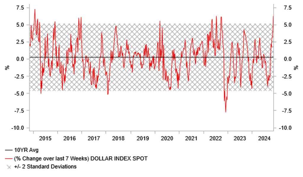 The US dollar has continued to trade at close to recent highs at the start of this week. The dollar index ran into technical resistance at the end of last week provided by the highs from autumn of last year at just above the 107.00-level. The US dollar is taking a breather after strong gains around the US election. The dollar index has risen by almost 7% since the end of September. It is the strongest equivalent period of gains since the autumn of 2022 which proved to be a significant peak for the US dollar. On this occasion we are more confident that the US dollar can extend its advance following the US election victory for Donald Trump and move closer to the highs set in September and October 2022 which are still around 5-6% higher. Donald’s Trump picks over the past week for his leadership team have reinforced market expectations that he will put into place his disruptive policy pledges. Two well-known China hawks Marco Rubio and Mike Waltz have been chosen to be the next US Secretary of State and National Security Advisor. Furthermore, Donald Trump has chosen Tom Homan to be his new border czar.