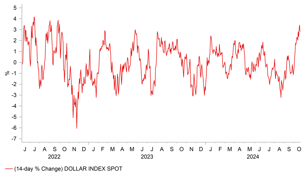 Economic data releases this week have also provided evidence that inflation is slowing more quickly outside of the US as evident by the downside surprises for the latest CPI reports released from Canada, New Zealand and the UK. The reports have encouraged market expectations that their domestic central banks will speed up the pace of rate cuts. The RBNZ has already recently delivered a larger 50bps rate cut, and we expect the BoC to deliver a larger 50bps rate cut next week. Market participants will be listening to BoE officials next week including Governor Bailey to see how recent softer inflation and wage growth has impacted their outlook for policy. We still expect the BoE to deliver back-to-back rate cuts in November and December despite the release this morning of stronger UK retail sales growth in September. It was the third consecutive month of positive retail sales growth in Q3. At the same time, the ECB sped up the pace of easing at yesterday’s policy meeting and left the door open to another rate cut in December (click here). Bloomberg subsequently reported that ECB officials reckon another rate cut in December is highly likely according to people familiar with the matter although larger 50bps cuts are not being discussed. With the Fed set to slow rate cuts while other G10 central banks are speeding up easing, it will keep upward pressure on the US dollar in the near-term.