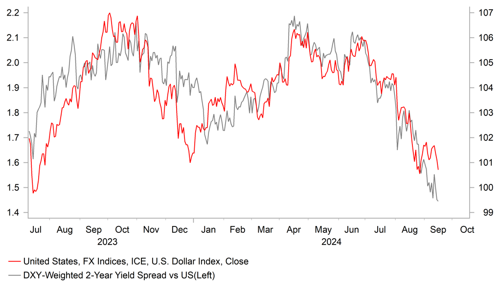 DXY VERSUS DXY-WEIGHTED 2YR YIELD SPREAD