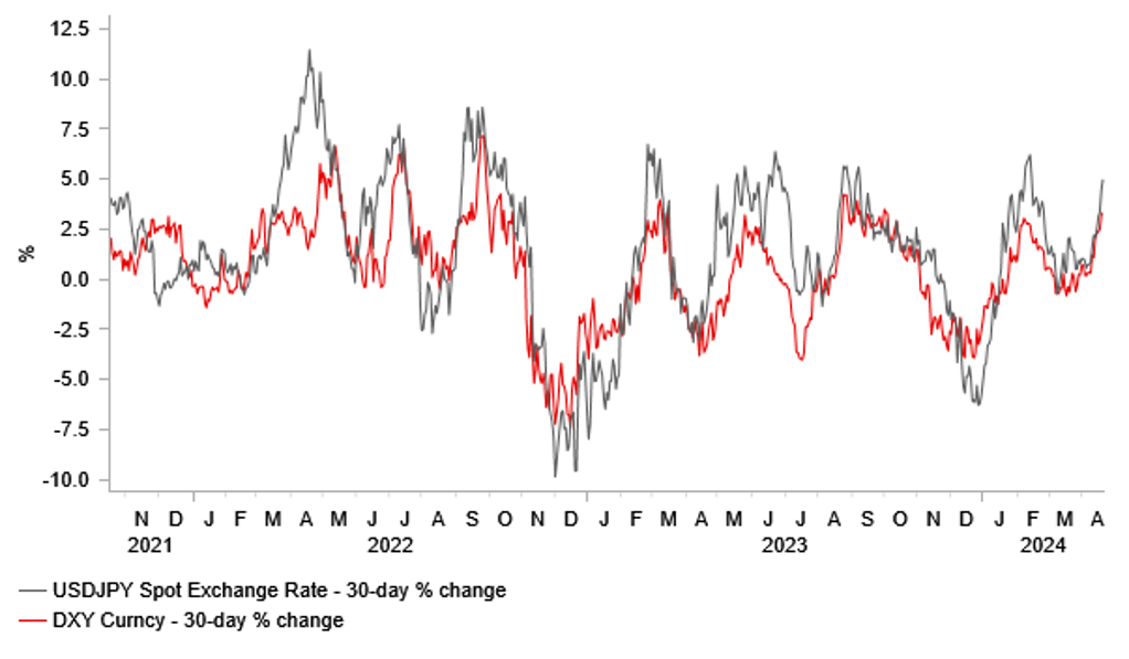 USD/JPY MODERATELY OUTPERFORMING BROADER USD IN 30-DAY PERIOD
