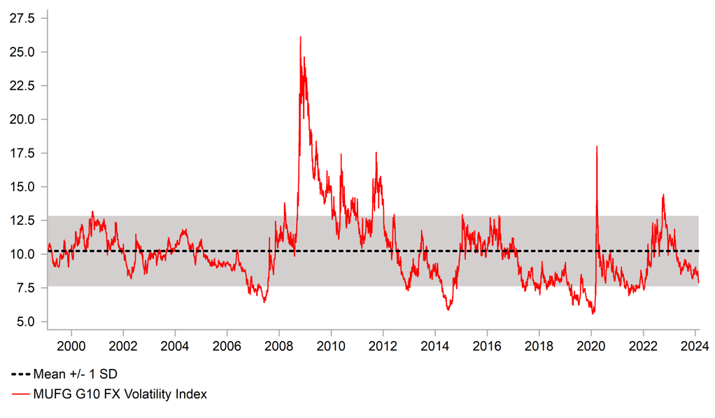 Momentum last week did fade somewhat for the dollar. In a week in which the 2yr UST note yield jumped around 20bps, the dollar (DXY) barely moved, up just 0.2%. The 2yr yield in core Europe did also gain by about 15bps but the 2yr Gilt yield gained just 2bps. The 2yr JGB yield advanced by 5bps. Last week also saw recessions confirmed in the UK and Japan while growth in the euro-zone was flat. That had limited impact in fuelling divergence trades as the outlook for growth is improving in Europe and Japan. In that regard the advance PMI data on Thursday will be potentially crucial for rates and FX. If we don’t see the expected further improvements in PMIs in Europe, the dollar could make more notable gains if inflation concerns continue to provide support for US bond yields, which seems likely over the short-term. Still, there is a lack of top tier data releases this week and today is a US holiday so it seems likely that low FX volatility conditions are likely to continue.