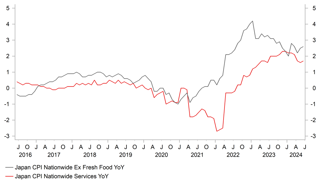 The yen has continued to reverse overnight some of the strong gains from earlier this week. After hitting a low of 155.38 yesterday, USD/JPY has risen back up closer to the 158.00-level overnight. There have been two developments during the Asian trading that have contributed to a weaker yen. Firstly, Japan’s Finance Minister Shunichi Suzuki warned fellow cabinet minister Kono Taro to be more cautious when talking about the yen. During his regular press conference, Finance Minister Suzuki stated that “I would like him to be careful in what he says, given that comments could have unexpected impacts on the market”. In a Bloomberg interview earlier this week, Digital Minister Kono Taro stated that the BoJ needs to raise interest rates to help strengthen the yen to bring down inflation in Japan. The public rebuke from Finance Minister Suzuki will have dampened some speculation over the BoJ moving to tighten policy at the end of this month and contributed to the weaker yen overnight. At the same time, the yen has been undermined by the release overnight of the slightly softer CPI report from Japan for June. The report revealed that headline inflation unexpectedly remained unchanged at 2.8% in June for the second consecutive month compared to the Bloomberg consensus expectation for an uptick to 2.9%. The measures of core inflation did pick-up in June but slightly less than expected. The Japanese-style core inflation measure excluding food increased by 0.1ppt to 2.6% in June and the core-core measure excluding fresh food and energy by 0.1 point as well to 2.2%. While those figures may have dampened some speculation over the BoJ tightening policy further at the end of this month, the breakdown was more supportive for our call for the BoJ to hike rate by a further 0.15 point. The report revealed that services inflation picked up for the first time since November 2023 by 0.1 point to 1.7% in June which should give the BoJ more confidence that the underlying inflation pressures are moving in the right direction and is indicative of a positive wage-price cycle being in place.