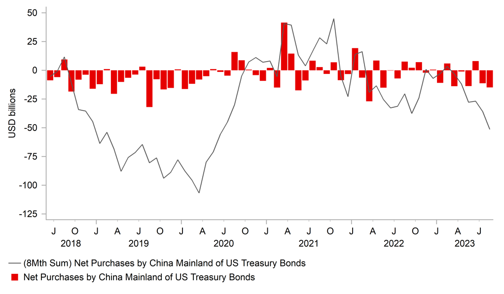 There will be increased market focus on the comments from Fed Chair Powell tonight who speaks at the Economic Club of New York. We will be listening closely to see if he repeats the message from other Fed officials over the past week that the Fed can wait and see before deciding whether to raise rates further. The sharp tightening in US financial conditions from the adjustment higher in market yields has taken pressure off the Fed to respond more immediately to the recent run of stronger activity data. By taking their time the Fed will be able to better understand how sustainable the growth pick-up is likely to be and what is driving the sharp adjustment higher in US yields. Bloomberg is highlighting today as well that Chinese investors sold the most US securities in Augustin four years. There were net sales of USD21.2 billion of which USD5.1 billion were Us equities and USD14.9 billion were US Treasury bonds. It takes cumulative net sales of US Treasury bonds to USD51.4 billion in the first eight months of this year. The highest amount since the 1H 2020 when the COVID shock first hit. The report will add to current bearish sentiment towards US Treasuries. The US rate market has already moved to almost fully price out another hike at the next FOMC meeting on 1st November which should limit downside for the US dollar from Fed Chair Powell’s comments today unless he more strongly indicates that they less inclined to hike rates again in the current tightening cycle.