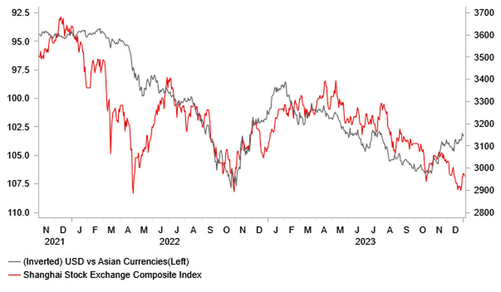 The main economic data releases over the year end period have been latest PMI surveys from China. The official PMI surveys revealed that business confidence both in the manufacturing and non-manufacturing sectors was weaker than expected in December. The manufacturing PMI unexpectedly fell by 0.4 point to 49.0 in December. It was the third consecutive month that business confidence in the manufacturing sector had declined after putting in place a peak of 50.2 in September. It compares to last year’s average of 49.9. Business confidence in the non-manufacturing sector is not much better either. The non-manufacturing PMI increased only marginally by 0.2 point to 50.4 in December after hitting its lowest level in November since December 2022. Overall, the official PMI surveys continue to send a cautionary signal over the health of China’s economy. After growth picked up in Q3, it appears that China’s economy slowed heading into the end of last year. The weak cyclical performance of China’s economy will keep pressure on domestic policymakers to provide further stimulus to support growth in 2024. Bloomberg has noted that China’s government is likely to front-load fiscal spending in 2024 with unused funds from last year likely to be spent. In October of last year, the government made the unusual announcement that it was adding USD1 trillion to its annual budget. Ongoing investor concerns over weak cyclical momentum in China remain a headwind for the renminbi and Asian currencies at the start of this year. China’s equity market finished close to year date lows in 2023.