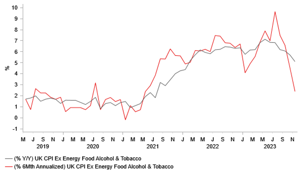 The main reason why the latest UK CPI report has triggered a bigger pound sell-off is that it has challenged the view that the BoE will lag behind the other major central banks of the ECB and Fed when beginning to cut rates next year. It had previously been thought that persistent inflation risks were greater in the UK and would continue to make the BoE relatively more cautious over cutting rates. However, there is building evidence now that inflation in the UK is also coming down quickly like in the US and euro-zone with a lag. The annualized rate of core inflation in the UK over the last six months has slowed sharply to 2.4% in November down from a peak of 9.6% in July. While the data can more volatile on monthly basis in the UK, it is becoming harder for MPC members to dismiss the recent improvement in underlying measures of inflation. There was also further encouraging news yesterday when Cornwall Insight announced that they expect the Ofgem cap on domestic energy bills will fall by 14% in April of next year reflecting the drop in wholesale gas prices since mid-November. The favourable developments are reinforcing market expectations that headline inflation could fall back to the BoE’s 2.0% target in 1H of next year setting the stage for the BoE to begin cutting rates from Q2. While it is in line with our current forecasts for BoE policy (click here), the faster decline in inflation poses downside risks to our near-term pound forecasts.