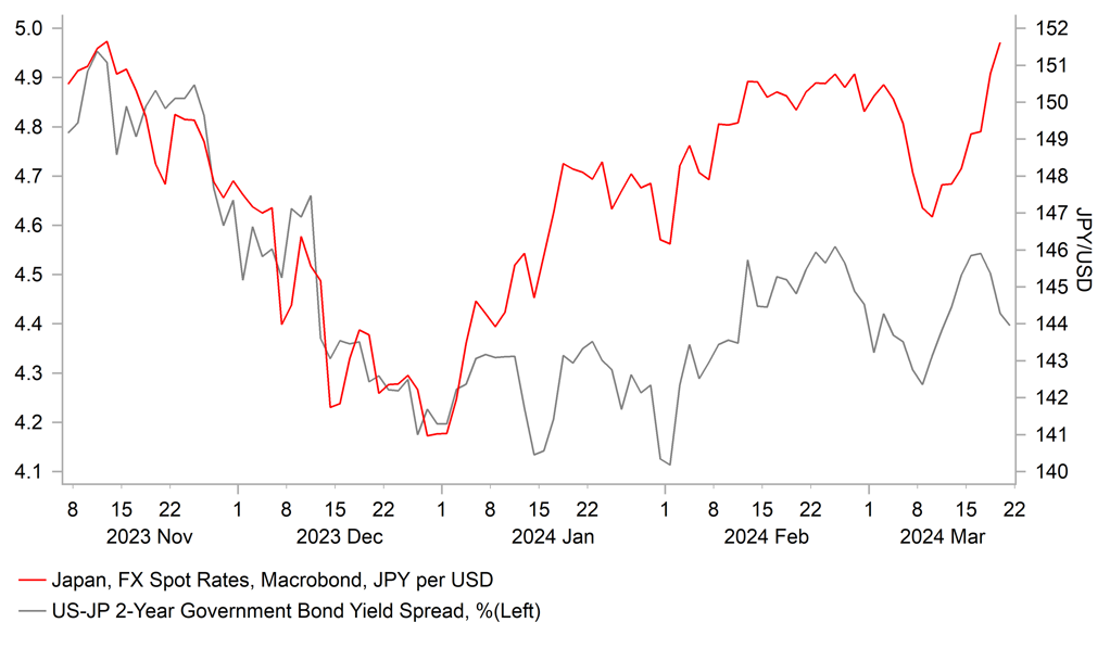 The dovish policy surprise from the Fed has helped to at least temporarily disrupt the heavy sell-off for the yen which has followed this week’s BoJ policy update. After threatening to test the highs from recent years at just below the 152.00-level yesterday, USD/JPY briefly dropped back to a low overnight at 150.27 although it has since climbed back up towards the 151.00-level. The sharp yen sell-off in recent days has drawn more concern from Japanese policymakers overnight. Finance Minister Suzuki warned that it is “important that FX moves stably” and that he is watching “forex moves with a sense of urgency”. Similarly, Chief Cabinet Secretary Hayashi emphasized that it is “important that forex moves in line with fundamentals”, and that he is “watching forex with a high sense of urgency”. The comments clearly represent a step up in the level of concern displayed by Japanese officials over the recent sharp sell-off for the yen as USD/JPY moves back within touching distance of the highs from recent years. It supports our view that it will be more difficult for the yen to weaken further beyond the low 150.00-levels as the threat of intervention increases. Now that the BoJ has started to tighten monetary policy, Japan has stronger grounds to intervene if the yen was judged to have diverged from fundamentals.