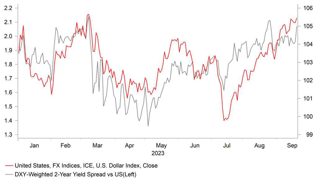 The US dollar has continued to strengthen during the Asian trading session following yesterday’s FOMC meeting resulting in the dollar index hitting an intra-day high of 105.69. The stronger US dollar has been encouraged by the adjustment higher in US yields overnight. The 2-year Us Treasury yield has jumped by around 12bps since just before yesterday’s FOMC meeting and hit an intra-day high overnight of 5.18% which is a new cyclical high after it broke above the high from July at 5.12%. The move higher in yields at the short-end of the US curve has also lifted the long end but to a lesser extent with the 10-year US Treasury yield having increased by around 10bps to a new cyclical high of 4.45%. The main trigger was the Fed’s decision to deliver a hawkish hold overnight. While the Fed left the policy rate unchanged, the updated guidance provided a stronger signal that the Fed plans to keep rates higher for longer. It has prompted the US rate market to scale back expectations for rate cuts from the Fed next year. The US rate market is now pricing in around 58bps of cuts by the end of next year. Almost 50bps of cuts have been taken out of the US curve so far this month which is helping to provide more support for the US dollar.