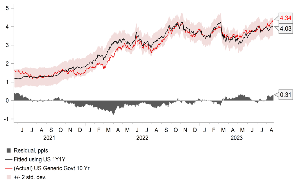 There has been a strong run of positive US economic surprises over the last couple of months which has dampened fears over a sharper slowdown for the US economy. It is reflected in the upward revisions to the outlook for the US economy. The Bloomberg consensus forecast for US GDP growth this year has almost doubled from around 1.1% in early June to 2.0% at present. The resilience of the US economy to higher rates continues to surprise market participants, and has prompted market participants to scale back expectations for rate cuts next year. The implied yield on the December 2024 Fed Fund futures contract has increased by around 35bps to 4.41% from the low earlier this month. Even after the recent scaling back of rate cut expectations, market participants are still expecting around 100bps of cuts next year. The sharper than expected slowdown in US inflation and lagged impact of monetary tightening are expected to create room for the Fed to make policy less restrictive in 2024. In the near-term though the resilience of the US economy and higher long-term US yields are proving more support for the US dollar.