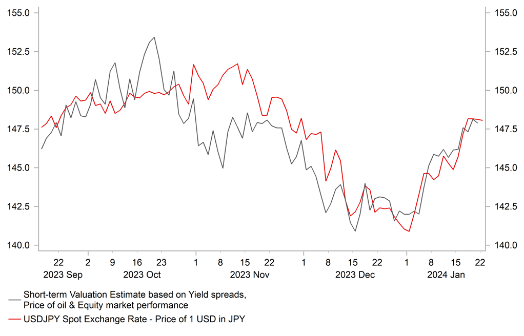 The yen has continued to trade at weaker levels ahead of tomorrow’s BoJ policy update. USD/JPY remains close to the year to date high recorded on Friday at 148.80. So far this month the yen has been the worst performing G10 currency. It has weakened by almost 5.0% against the US dollar. The sharp adjustment higher for USD/JPY at the start of this year has been driven by two main fundamental drivers. Firstly, the US dollar has rebounded across the board supported by a pickup in US yields. The 10-year US Treasury yield hit a year to date high on Friday of 4.20% as it moved further above the low from the end of last year of 3.78%. The resilience of the US economy at the end of last year has cast some doubt on how soon the Fed is likely to begin cutting rates this year. The probability of the first rate cut being delivered as soon as in March has fallen below 50% (there are currently 12bps of cuts priced in). Building optimism over a softer landing for the US economy has helped to propel the US equity market to a new record high at the end of last week. On Friday the S&P500 index broke above the previous record high of 4,818 from January of last year.
