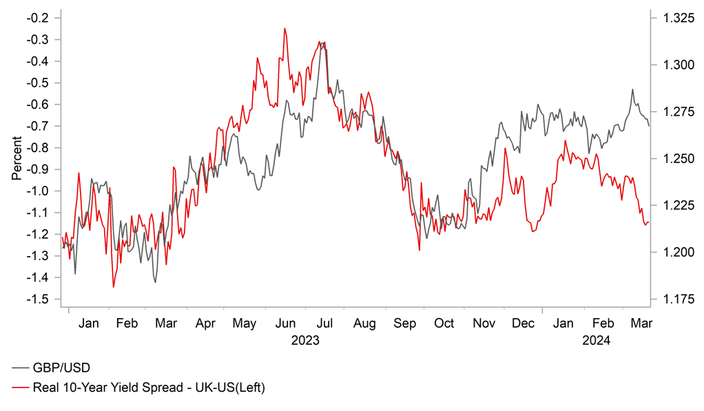 The pound could therefore suffer further over the short-term if the markets conviction on a June rate cut grows further and with that the potential extent of rate cuts in total delivered this year. The EU-UK 2-year rate spread is moving in favour of higher EUR/GBP and real yield UK-US spreads also point to the potential for broader GBP underperformance after a period of outperformance year-to-date.