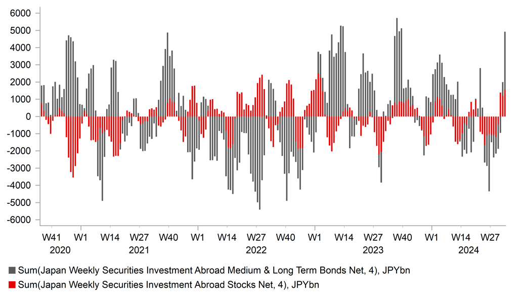 That four-week period captures a move in 10-year UST bond yields falling from over 4.25% all the way down to the brief low below 3.70% before settling in the 3.80%-4.00% range. It also captures the plunge in USD/JPY from over 155.00 and certainly from an FX perspective, the plunge is making foreign bond prices look more attractive and hence investors with greater risk appetite could have taken advantage of the FX drop to increase unhedged purchases. There are certainly plenty of examples of sudden declines in USD/JPY drawing in stronger demand for foreign securities.