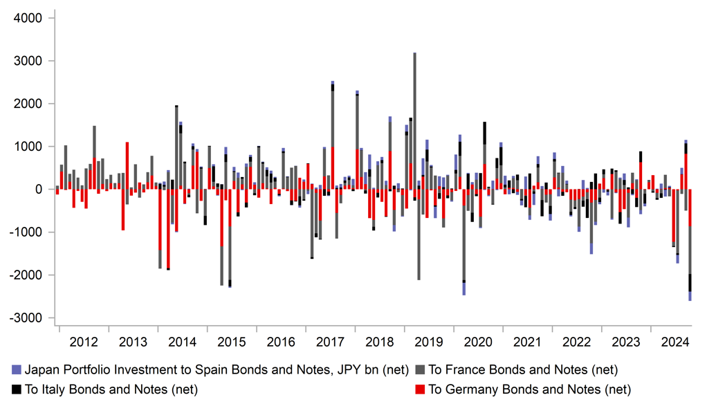 The euro selling and stretched short positioning could also have a political angle to it. We have a German election in February and the political landscape in France is also likely weighing on performance. The balance of payments statistics for October, which was before the escalation of political uncertainty in Germany (which took place on 7th Nov when Scholz dismissed his finance minister), still revealed substantial selling combined across the key euro-zone countries – Germany, France, Italy and Spain. Bond selling by Japanese investors totalled JPY 2,700bn, the largest month of sales for those four countries combined since the series began in 1995.
