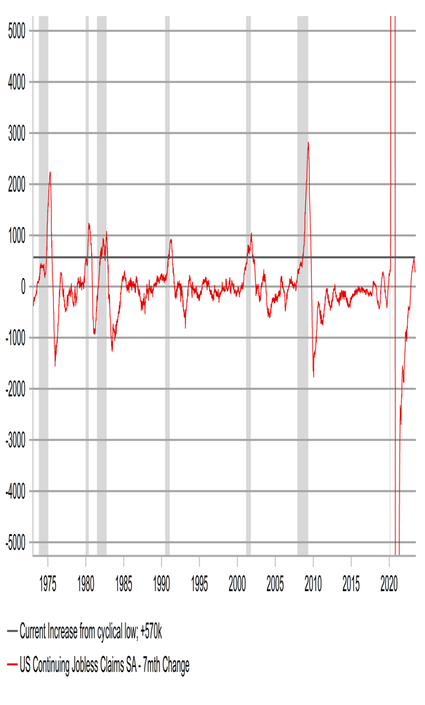 The continued claims data is also significant. The chart above highlights the change in claims over an 7-month period (this is the period since the cyclical low was hit last year to current high in April) and every time continued claims increases to the degree most recently (570k), the US labour market weakens notably and recession follows.