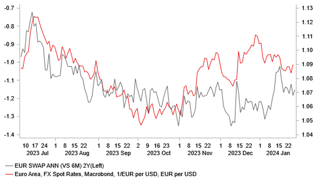 Despite the weak performance of the euro-zone economy, the ECB is still expected to present a relatively hawkish update at today’s policy meeting. There has been a busy schedule of ECB speakers in recent weeks who have delivered a unified message in pushing back against premature rate cut expectations. ECB officials have indicated that they want to see more evidence that wage growth is moderating at the start of this year before becoming more confident that they can begin to lower rates. President Lagarde sent a clear message over the potential timing of the first ECB rate cut when she stated that they plan to cut rates in the summer. We expect this message to be repeated at today’s policy meeting and for the ECB to continue to flag upside risks to inflation from geopolitical risks in the Middle East. The updated guidance from the ECB suggests that the earliest point at which the ECB is planning to cut rates is from the June although market participants are still pricing in a high probability that the first cut could be delivered even earlier in April (there are currently around 18bps of cuts priced in by then). It should mean that today’s ECB policy is more of a holding operation like yesterday’s BoC policy meeting which is likely to have limited impact on the performance of the euro.