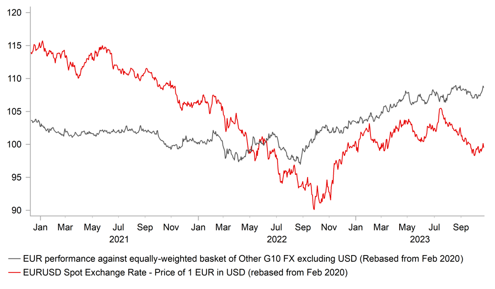 Our point in yesterday’s FX Daily still stands – despite yesterday’s drop in EUR/USD, at around the 1.0600 level there is still a case to argue EUR resilience given the market moves we have had over the last month in terms of the rise in US yields; increased periphery concerns related to Italy and the rise in natural gas prices after the Hamas attack on Israel. That resilience is highlighted by the chart above showing EUR/USD versus EUR performance against the remaining G10 currencies excluding the dollar. The EUR vs G10 ex-USD index hit a year-to-date high yesterday.