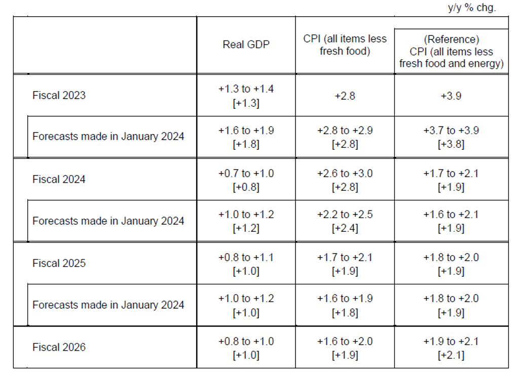 BOJ UPDATED GDP AND INFLATION FORECASTS APRIL 2024