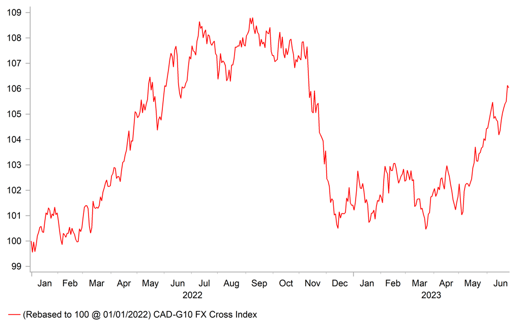Similar to other G10 central banks, the BoC has become uncomfortable that inflation is proving stickier than expected. At their last policy meeting they cited concern that three-month measures of core inflation have been running in the “3½-4% range for several months and excess demand persisting”. The Canadian economy has proven more resilient than expected at the start of this year. It is placing more pressure on the BoC to keep raising rates further into restrictive territory. The release today of latest Canadian CPI report for May will provide further insight into how sticky inflation is proving to be. The Canadian rate market is currently pricing in around 16bps of hikes for next month’s BoC policy meeting on 12th July with back to back 25bps hikes judged as more likely than not. A weaker than expected CPI report today poses the main risk of a set-back for the Canadian dollar’s recent bull run.