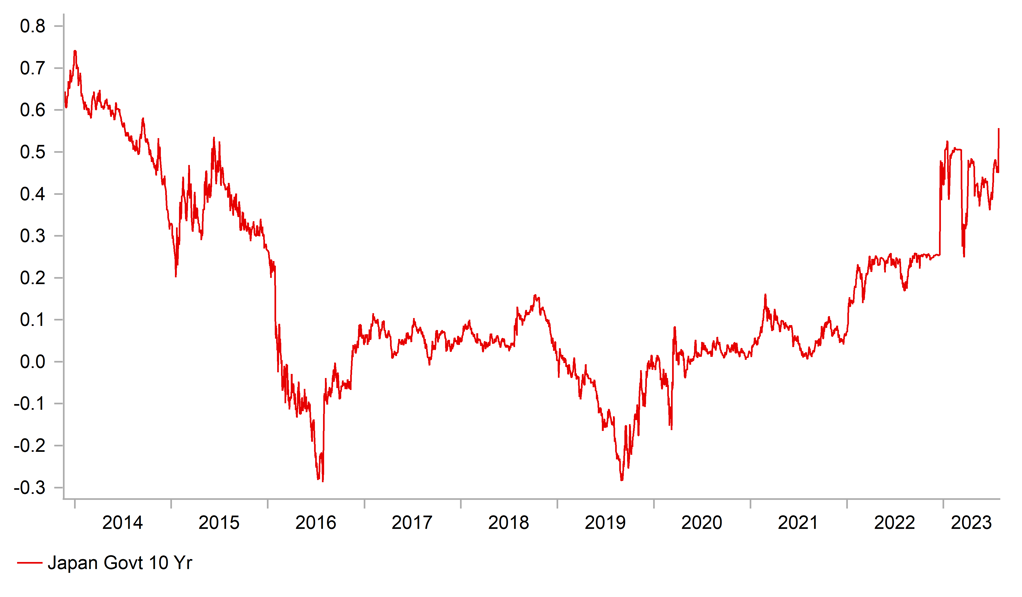 While the BoJ took action to make YCC more flexible in line with our expectations, it also emphasized that the sustainable and stable achievement of the price stability target has not yet come into sight, and thus will patiently continue with monetary easing. That judgement was backed up by the updated inflation forecasts from the Outlook for Economic Activity and Prices report. The report revealed a significant upward revision to the Japanese style core inflation forecast (CPI less fresh food) for the current fiscal year by 0.7ppt to 2.5% but more importantly the inflation forecasts for the following year were left more or less unchanged at 1.9% for FY2024 and 1.6% for FY2025. The BoJ did though judge that risks to inflation outlook for the current and next fiscal years are skewed to the upside.