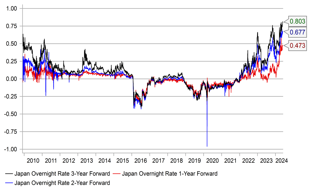 Uchida in his speech placed a lot of emphasis on the importance of the labour market and the stability in the labour market helping contribute to wages stagnating as part of this social norm. Supply of labour in the last decade of the mild deflation era was helped by older workers staying in the labour market thus increasing labour participation. With this positive fading, wages are rising which may result in a shift from this social norm. Uchida confidently stated that “labour market conditions have changed structurally and irreversibly”. The BoJ is assessing whether this will lead to a break in the “social norm” but he suggested so which we would argue is consistent with our view that the markets continue to under-price the potential BoJ tightening that lies ahead.