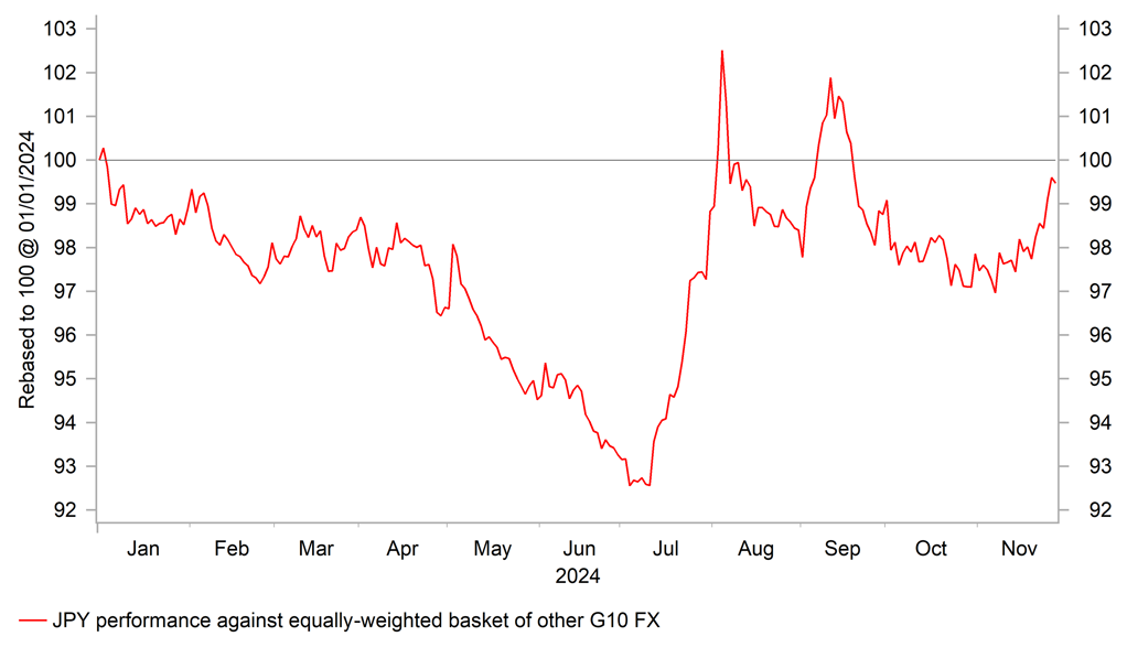 There was further evidence as well of stronger service sector inflation as companies continue to pass on higher wage costs. The headline service-price measure of inflation increased by 0.1 point to 0.9%. Overall, the report should give the BoJ more confidence that Japan’s economy and inflation are moving in line with their outlook which they have reiterated on a number of occasions would be sufficient to support further rate hikes. While it is not a done deal that the BoJ will hike rates next month, we now believe the recent run of stronger data will be sufficient to encourage the BoJ to hike rates and have brought forward our forecast for the next hike from January. An earlier rate hike from the BoJ is already helping to provide more support for the yen heading into year end. On 21st November, Governor Ueda stated that it’s not possible to predict the outcome of the December policy meeting and implied that the decision would be dependent on a lot more data and information available by then.