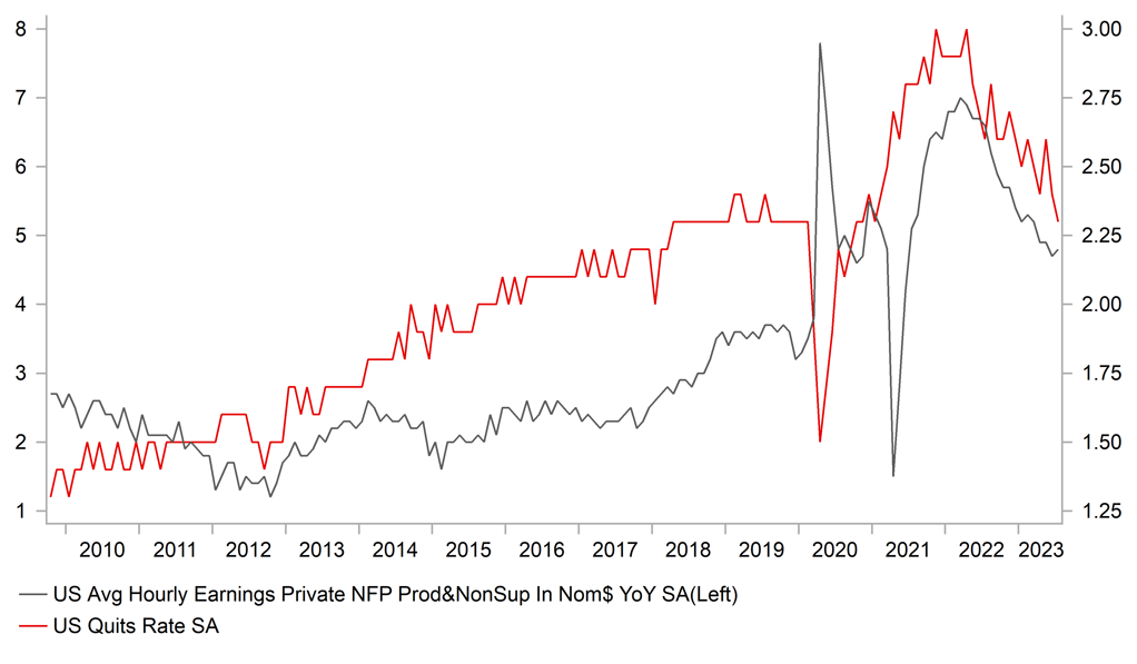 Since recording a low of 4.73% on 10th August, the UST 2yr note yield has grinded steadily higher and recorded a high of 5.10% on Monday – a 37bp increase in the 2yr yield in thirteen trading days. And then from that high in two trading sessions two-thirds of the move has reversed. That points to the sensitivity of the markets to data that points to economic weakness, and in particular weakness in the labour market – something the Fed is focused on going forward and may be required for the Fed to avoid hiking one more time. The JOLTS and consumer confidence data yesterday were both weaker than expected and certainly helped to reinforce the prospect of a slowdown in the jobs market going forward. The initial claims data of late has provided little comfort in that view but of course that’s a measure of firing. The JOLTS data is more a measure of the demand for hiring and job openings certainly retreated faster than expected in July – openings were expected to slow modestly to 9,500k but in fact declined to 8827k with the June data revised down. Job openings remain elevated but have now declined to the lowest level since March 2021. The 10-year pre-covid job