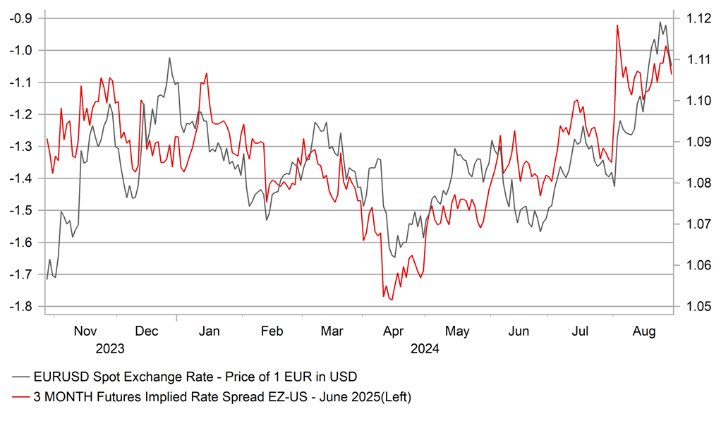 As of now that’s not our assumption but these scenarios seems to be at least partially priced given by June next year the OIS market is implying 140bps of cuts from the ECB, implying the policy rate dropping to around 2.25% (effective rate is 10bps lower than target currently). If you assume the achievement of the inflation goal by then that still implies a real policy rate from the ECB of just 0.25%. That’s on the low side in our view and hence the risk going forward is that we see this adjust higher. The rates market in core Europe saw a limited reaction to the weaker CPI data yesterday which highlights to us the richness of rate cut pricing. The 2-year UST note yield trading at 3.90% looks to have much more scope to move lower than the 2-year German yield at 2.35% when you consider current OIS pricing. This pricing discrepancy suggests better support for EUR/USD going forward.