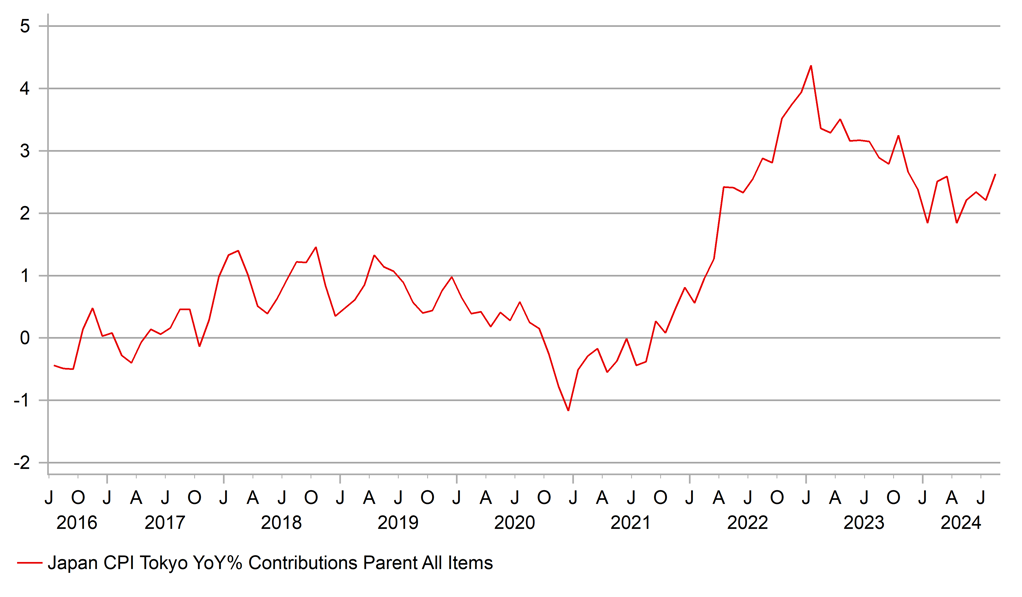 The data is entirely consistent with what the BoJ have argued is required in order to justify further rate increases – strong wage growth feeding through into inflation. The latest wage data saw the same sample cash earnings YoY rate increase from 2.3% to 5.4%. The services side of the Tokyo economy is also seeing a pick-up in inflation with service inflation accelerating from 0.5% to 0.7% - the Tokyo services inflation rate is lower than the nationwide rate due to specific factors like education subsidies. A tax rebate implemented by the government, effective June, may also be helping underlying demand conditions which are also being reinforced by the return of positive wage growth in real terms.