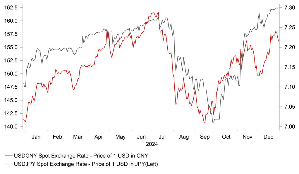 The Chinese bond market has seen a sharp drop in yields over the past month partly in anticipation of further rate cuts from the PBoC. Yields on the 2-year and 10-year government bonds have fallen by around 30-35bps this month taking them to new record lows. PBoC Governor Pan encouraged rate cut expectations yesterday when he told the People’s Daily that he believes China still has room to cut banks’ reserve requirement ratio as the local industry average of about 6.6% is high compared with other major economies. While yields have fallen sharply in China at the end of this year, yields in other major economies have been rising. The US 2-year and 10-year government bond yields have risen by around 10bps and 35bps respectively. The 10-year US Treasury yield is finishing the year closer to the year to date high set in April at 4.74%. Upward pressure on US yields particularly at the long end of the curve reflects investor unease over the potential inflationary impact from the incoming Trump administration’s policy agenda. The Fed has already displayed more caution over cutting rates further next year in light of potential policy changes. With yield spreads continuing to widen between the US and China it should encourage a further adjustment higher for USD/CNY with a weaker CNY likely to be used as well as an adjustment mechanism to help offset the negative impact from Trump’s tariff hikes. USD/CNY has been held just below the 7.3000-level over the Christmas holiday period and domestic policymakers are likely to continue to favour a gradual move lower for the renminbi rather than sharp one-off adjustment. Our latest forecasts show the renminbi weakening against the US dollar throughout 2025 moving up towards the 7.5000-level with risks skewed in favour of a bigger move higher for USD/CNY.