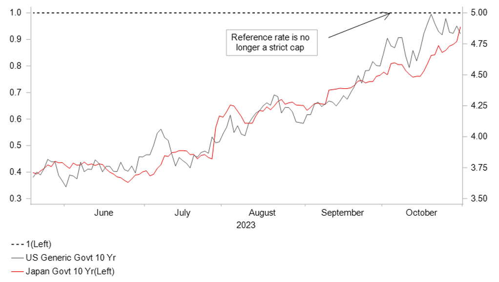 Similar to after the last YCC policy tweak in July, today’s policy update appears unlikely to reverse the yen weakening trend on its own. It will place more pressure on Japanese policymakers to intervene if they want to prevent the yen from weakening further heading into year end. The initial yen weakening reaction maybe somewhat disappointing for the BoJ as Governor Ueda noted that they considered FX in today’s policy decision similar to in July. The BoJ was concerned that maintaining the strict 1.0% YCC cap could have exacerbated yen weakness if they were forced to defend it through larger JGB purchases.