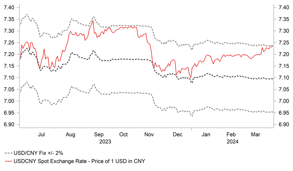 Potential reasons for the subtle shift in current policy include: i) a reshuffle of the monetary policy committee at the PBoC, ii) allowing USD/CNY to adjust for the recent re-widening of the yield spreads in favour of the USD, and iii) attempting to dampen CNY strength against other important trading partners currencies which has resulted recently from trying to keeping USD/CNY stable while the USD has rebounded more broadly at the start of this year. The yield spread between 10-year US and Chinese government bonds has risen back to its highest level since late last year when USD/CNY was trading closer to the 7.3000-level. The CFETS CNY basket has increased by around 2.5% this year, and has reached highest level in around a year.