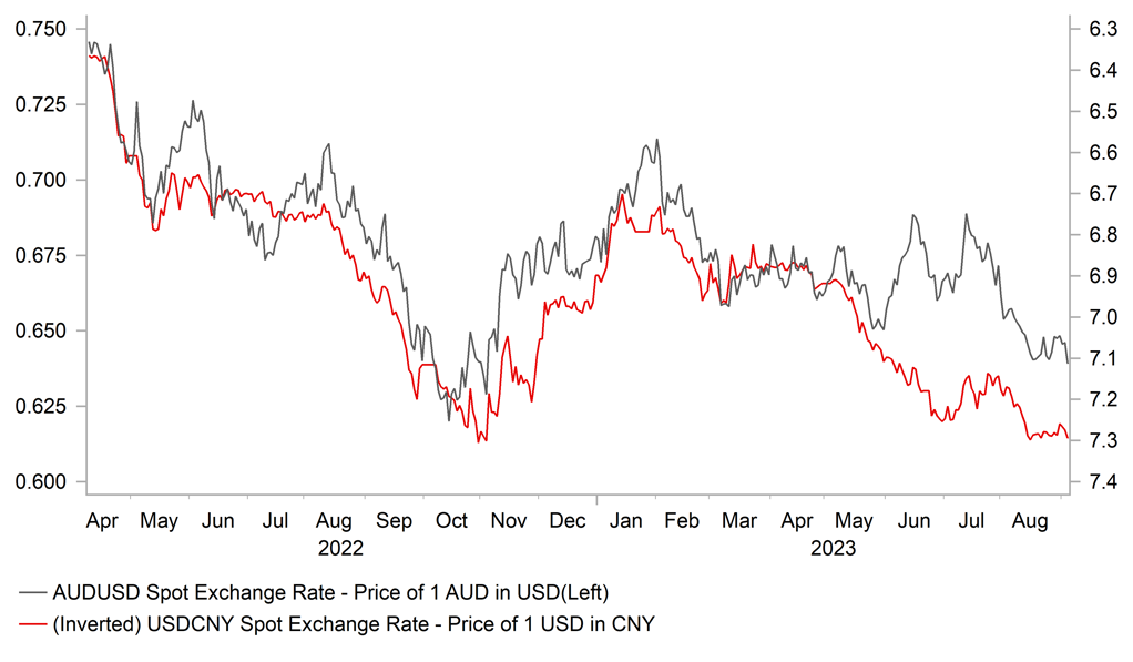 The biggest mover overnight has been the Australian dollar which has weakened sharply against the US dollar by just over 1% resulting in the AUD/USD rate falling back below the 0.6400-level. The main drivers for the Aussie sell-off overnight has been the RBA’s latest policy update and China growth concerns. The RBA decided to leave the policy rate unchanged at 4.10% for the third consecutive month. It was the last policy meeting before RBA Governor Philip Lowe is replaced by Deputy Governor Michele Bullock on 18th September. The decision to leave rates on hold again has reinforced market expectations that the RBA has reached the end of their hiking cycle although the update guidance continued to signal that they remain ready to raise rates again if required. The RBA continues to note that “some further tightening may be required… but that will depend on the data and evolving assessment of risks”. The Australian rate market is currently pricing in around 8bps of hikes by the end of this year followed by one 25bps rate cut by the end of next year. The decision to leave rates on hold today was in line with market expectations. The recent data flow including lower than expected inflation print for July has helped to ease pressure on the RBA to hike further.