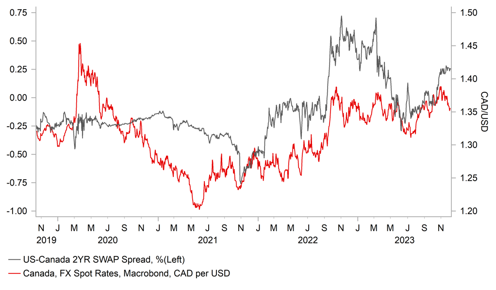 The Canadian dollar has been one of the laggards in this period of US dollar selling and since the beginning of November is the 3rd worst performing G10 currency (only EUR and USD behind) with a similar extent of monetary easing priced into the OIS curve – a little over 100bps by Q4 2024. The data that has been coming in suggests to us that the extent of easing priced in Canada is more justified than in the US. The economy is on the brink of technical recession following the GDP data for Q3 released in November revealed a contraction of -1.1% on a SAAR basis.